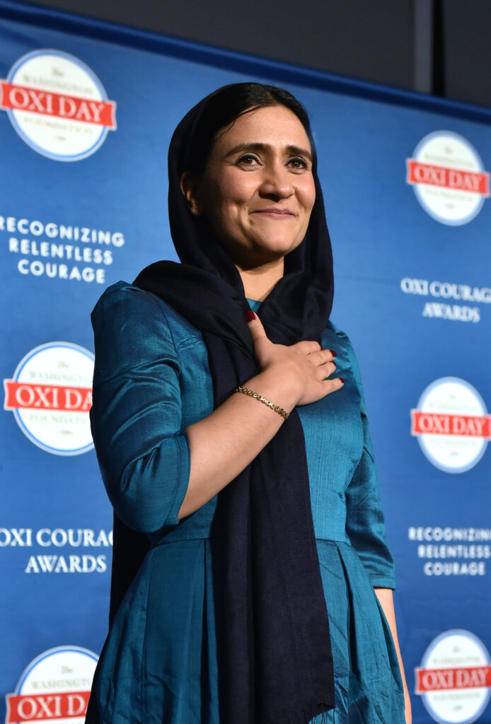 WASHINGTON, DC, November 29, 2024 – Afghan educator, humanitarian and women’s rights champion Shabana Basij-Rasikh received the 2024 OXI Courage Award at the US Institute of Peace in Washington, DC on October 30. Presenting the award to Basij-Rasikh was 2016 OXI Courage Award and 2018 Nobel Peace Prize Laureate Nadia Murad.