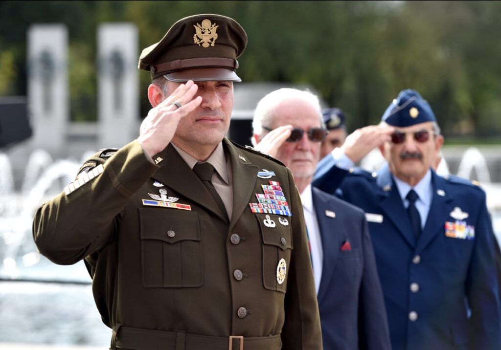 WASHINGTON, DC, October 28, 2021 – At the majestic National WWII Memorial in our nation’s capital, the Washington Oxi Day Foundation honored Efthemios J. “Tim” Bentas, Stephen Cherpelis and Peter Vergadoswith its annual Service Awards for courageously risking their lives in WWII, Korea and Vietnam. On the sunny afternoon of October 28th, amid a quintet’s military medley and the Memorial’s 50 fountains, an audience of international and American dignitaries witnessed the presentation of the Vasilios S. Haseotes Service Award to WWII Veteran Bentas by Zacharie Haseotes Vinios; the presentation of the Calamos Service Award to Vietnam Veteran Vergados by decorated Vietnam Veteran John Calamos; and the presentation of the Oxi Service Award to Korean Veteran Cherpelis by Greek Defense Attaché Col. Panagiotis Vlachopoulos.