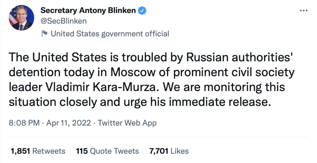 Secretary of State Antony Blinken, when Kara-Murza was originally detained, called for his release tweeting: