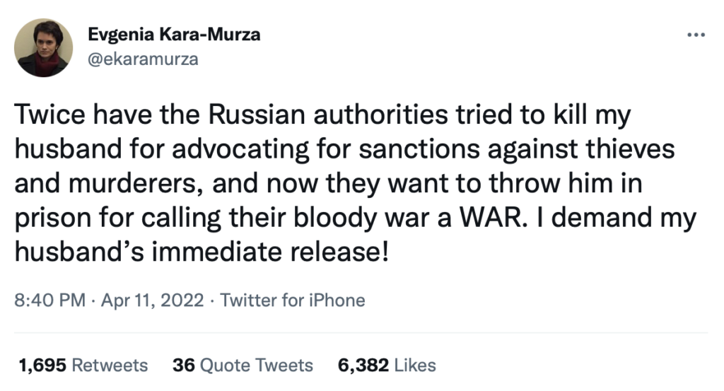 Kara-Murza’s wife, Evgenia Kara-Murza, confirmed his arrest in a tweet late Monday, saying: