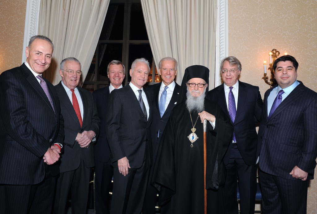 (L to R) Senator Schumer, Senator Sarbanes, Senator Baucus, Dennis Mehiel, Vice President Biden, Archbishop Demetrios, Jim Chanos, George Tsunis